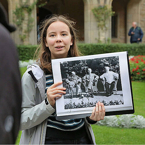 Mit dem Kriegsende 1945 beginnt eine fast fünf Jahrzehnte währende sowjetische Nutzung rund um den Potsdamer Neuen Garten. Vielfältige Spuren dieser Zeit lassen sich heute noch entdecken und stehen im Mittelpunkt des geführten Rundgangs. Die Tour beginnt am Schloss Cecilienhof - dem historischen Ort der Potsdamer Konferenz. Noch heute erinnern Spuren wie kyrillische Einritzungen an das bedeutende Alliiertentreffen. Durch den einstigen Vergnügungspark für sowjetische Militärangehörige führt der Weg zum Gelände der ehemaligen Geheimdienststadt „Militärstädtchen Nr. 7. In der „verbotenen Stadt“ sind neben dem Hauptquartier der sowjetischen Militärspionageabwehr u.a. Relikte einer Denkmalanlage zu sehen. Sie zeugen vom Alltag der hier stationierten Geheimdienstmitarbeiter und KGB-Wachsoldaten. Die Führung endet im Innenhof des ehemaligen Untersuchungsgefängnisses der Spionageabwehr in der Leistikowstraße. Dort hielt der Geheimdienst bis 1991 zahlreiche sowjetische und deutsche Bürgerinnen und Bürger gefangen.